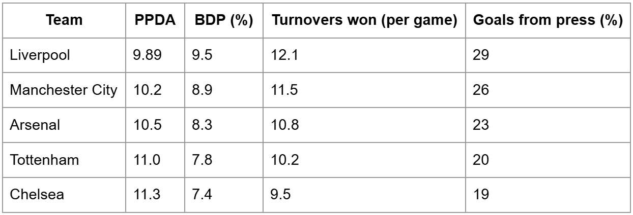 The pressing metrics of the top Premier League teams: