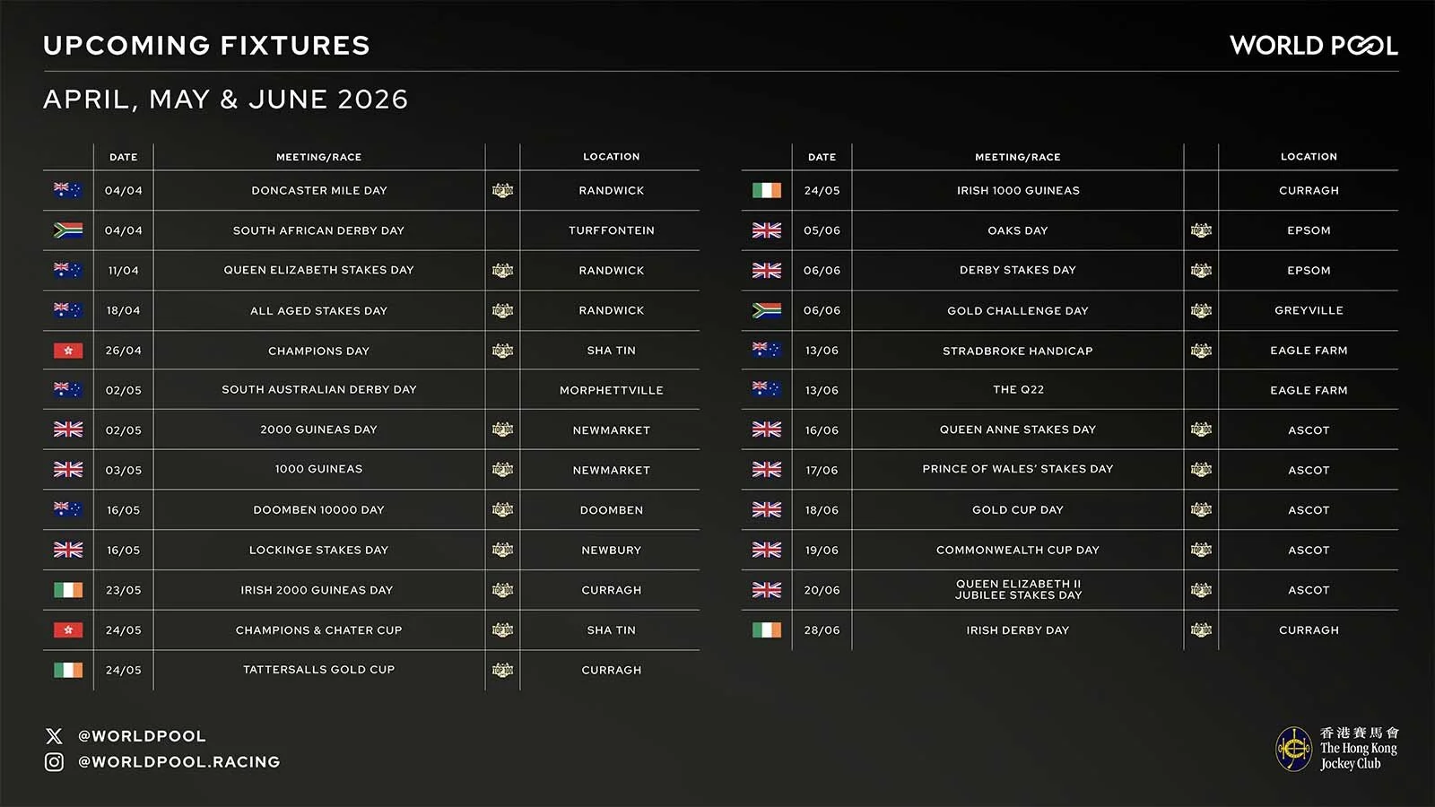 Newmarket’s 1000 Guineas and the Oaks from Epsom will return as World Pool races this year, with the full list of 2026 Q2 fixtures being confirmed by the Hong Kong Jockey Club.