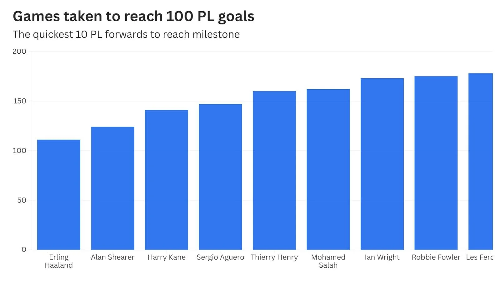 Here’s a graph to visualise Haaland’s dominance in the top flight since his arrival, setting him against other prolific strikers to reach the fabled century: